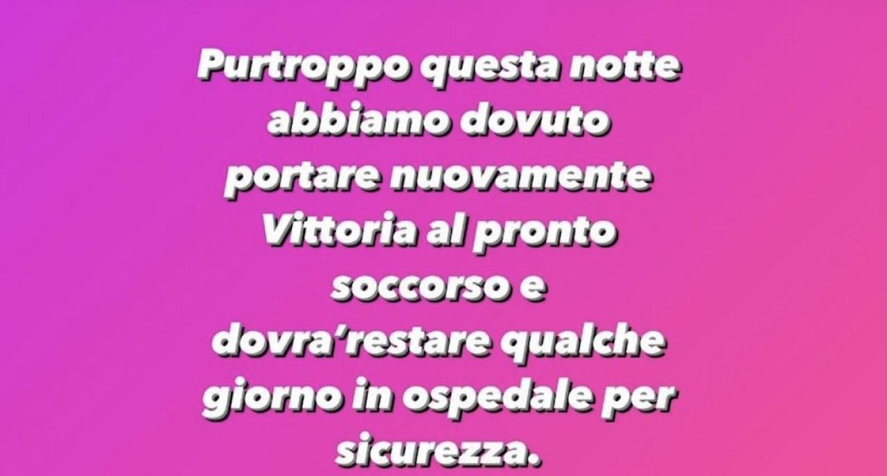 Vittoria Lucia Ferragni, la secondogenita di Chiara Ferragni e Fedez, è stata ricoverata in ospedale per qualche giorno a causa di un virus. A farlo sapere è l'imprenditrice che nelle storie Instagram scrive: "Stanotte abbiamo dovuto portare nuovamente Vittoria al pronto soccorso e dovrà restare qualche giorno in ospedale per sicurezza", scrive Chiara Ferragni.